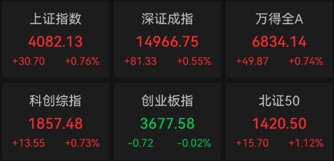 4月20日,四大股指收盘涨跌不一,沪指报收4082.13点,涨0.76%,深成指报收14966.75点,涨0.55%,创业板指报收3677.58点,跌0.02%,科创综指报收1857.48点,涨0.73%。