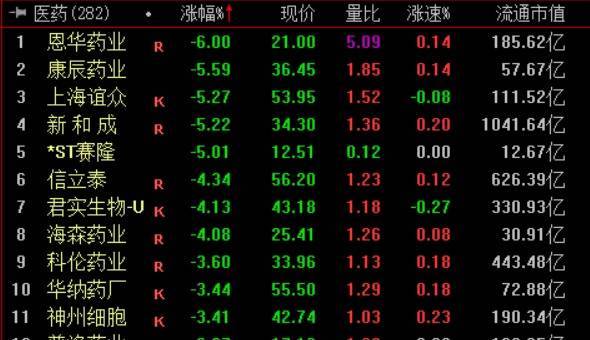医药板块逆市走弱,恩华药业、新和成等多股跌逾5%。