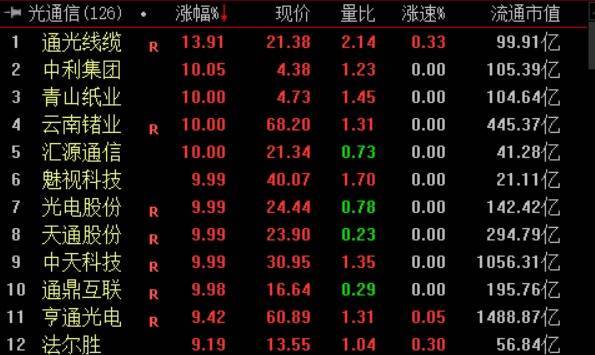 具体来看光通信概念股延续强势,通光线缆、中天科技等多股飙涨。