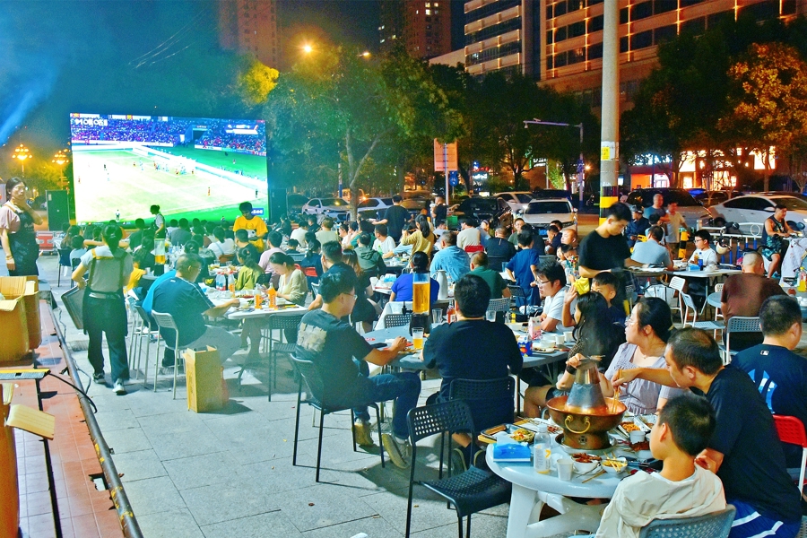 大量未能中签的球迷聚集在第二现场,一边用餐一边观看苏超比赛转播(视觉中国)