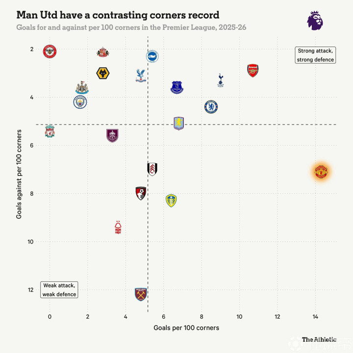 防守方面,曼联每100个角球失球7.1个——观察每百次角球数据可以在所有球队间创造一个公平的竞争环境,因为各队面对的角球次数可能不同——这是本赛季英超第五差的数据。然而他们每100个角球能进14.3个,这在2025-26赛季英超联赛中高居榜首。此外他们每100个角球也能创造7.1个预期进球,这是本赛季英超第二好的数据。除了引进姆伯莫改善了曼联的角球传中质量之外,球队在战术意图上更加清晰,球员们的意识也更强了。
