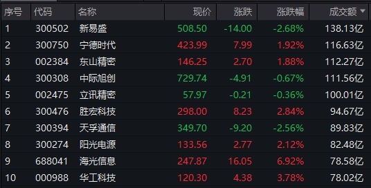个股方面,新易盛半日成交额超138亿元居首,宁德时代、东山精密、中际旭创成交额靠前。