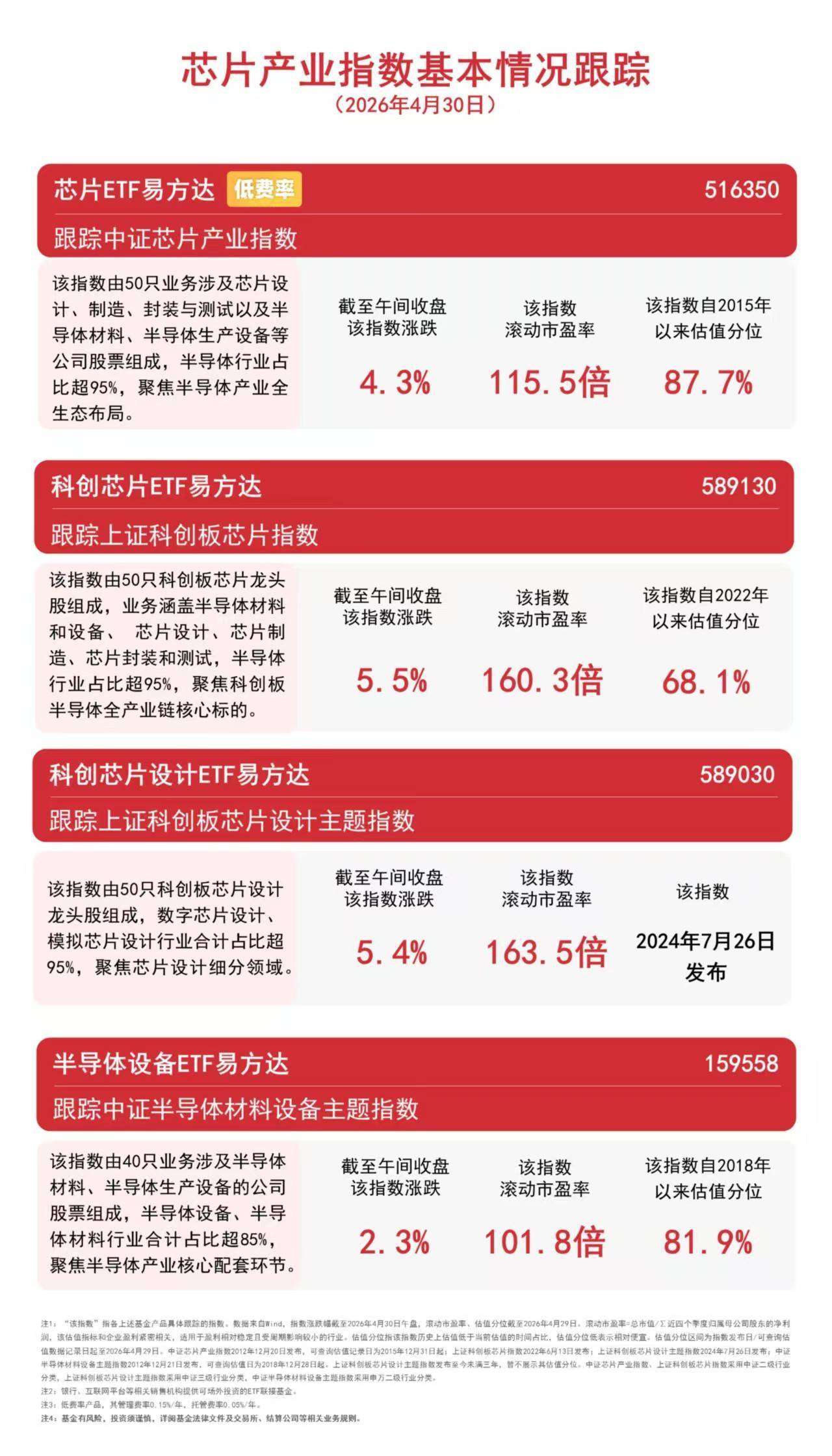 4月最后一个交易日,国产芯片产业链集体爆发,芯原股份20%涨停,寒武纪大涨17%、市值突破7000亿元。截至午间收盘,上证科创板芯片指数上涨5.5%,上证科创板芯片设计主题指数上涨5.4%,中证芯片产业指数上涨4.3%,中证半导体材料设备主题指数上涨2.3%。