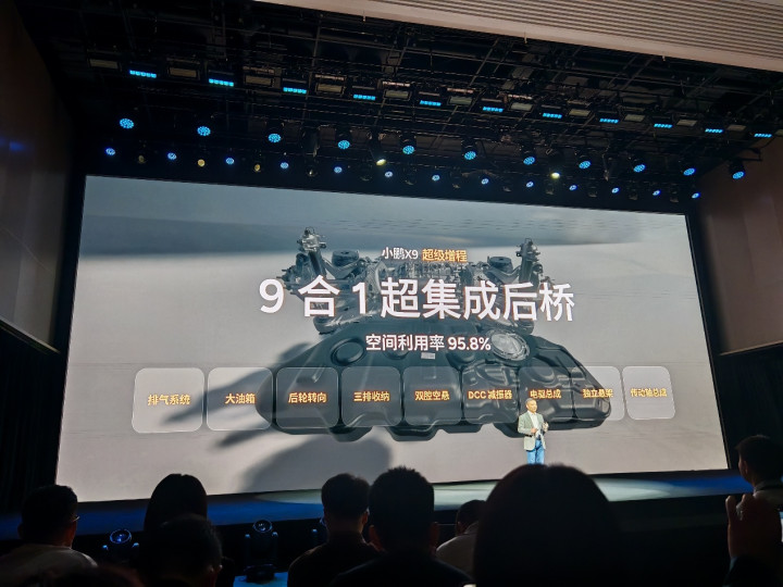 像小鹏X9,通过9合一后桥设计,在一个相对狭小的空间里,集成了后轮转向、大油箱、高功率电驱、三排一键收纳等功能,这类其他品牌难以做到的事情,就充分体现了小鹏扎实的技术功底。